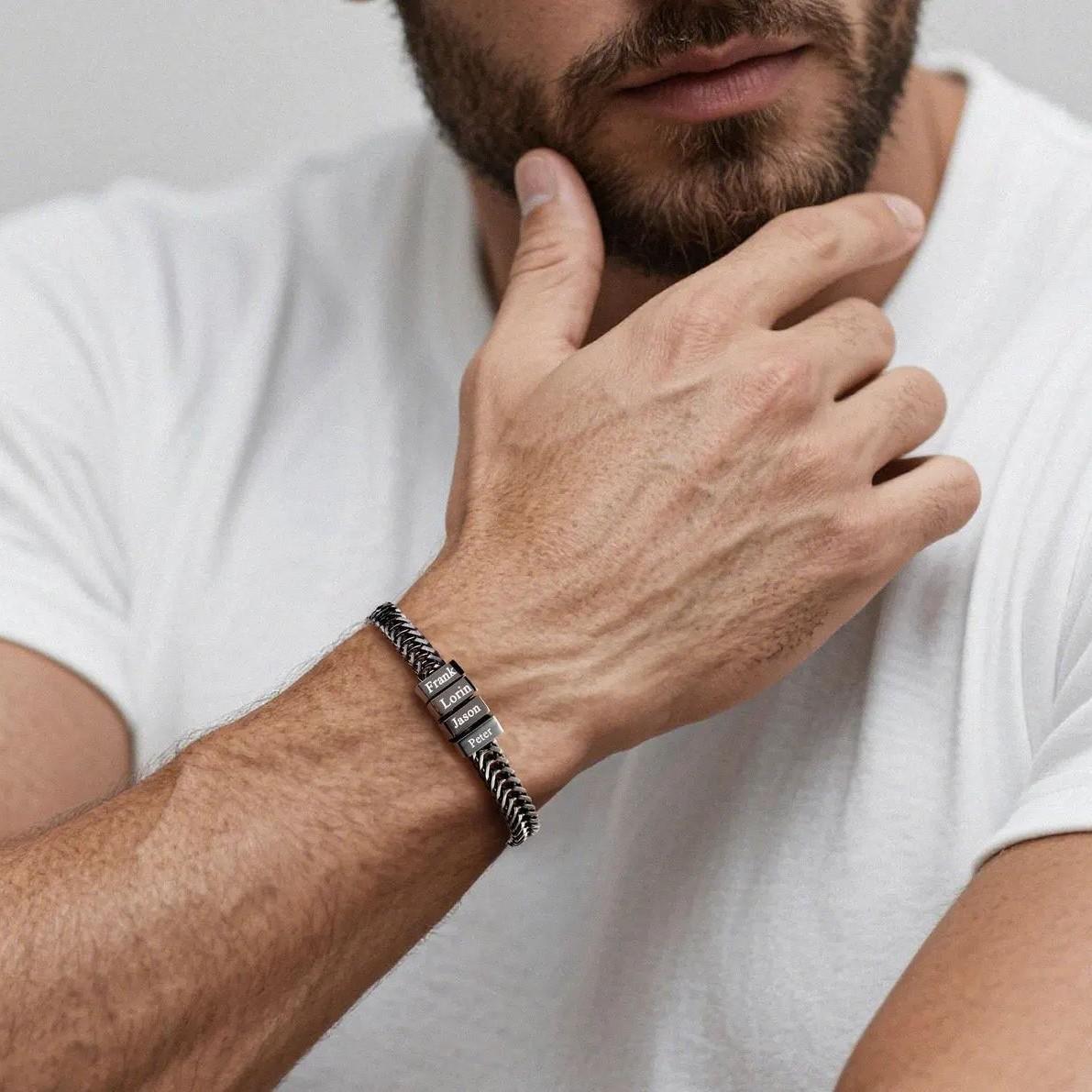 Men’s Stainless Steel Bracelet with DIY Engravable Name Beads – Personalized Father’s Day Gift Custom Name Beaded Bracelet for Dad Husband Grandpa