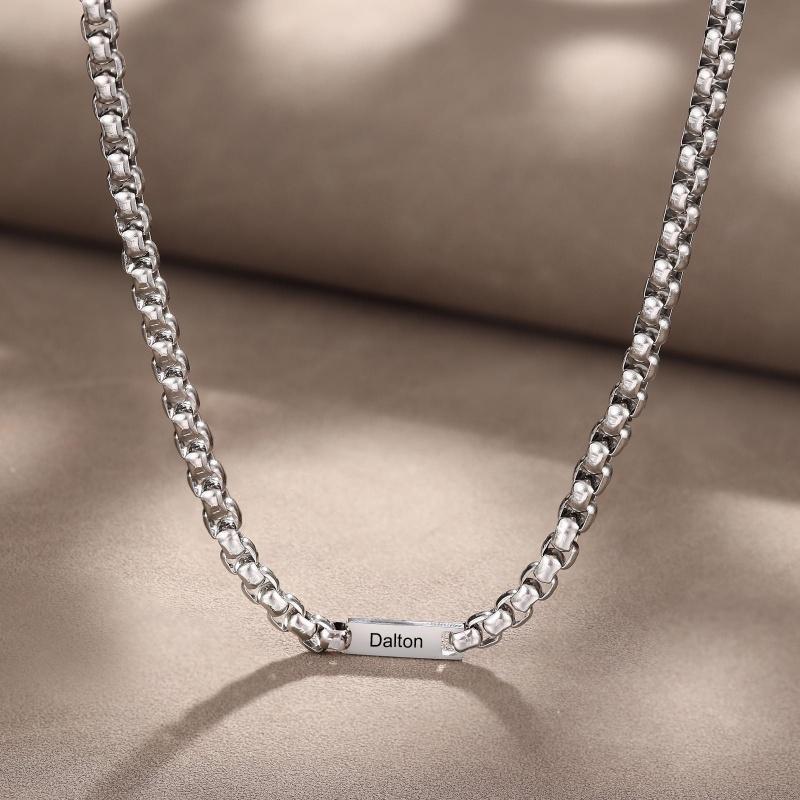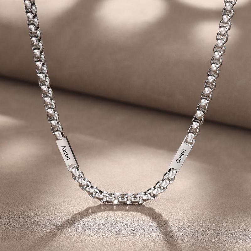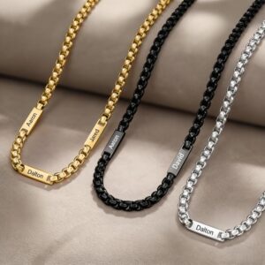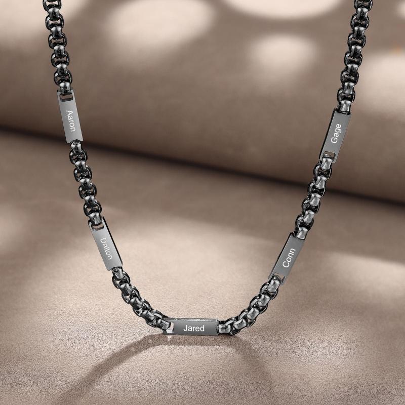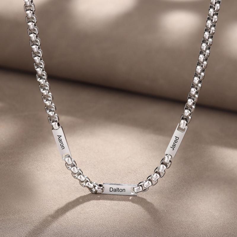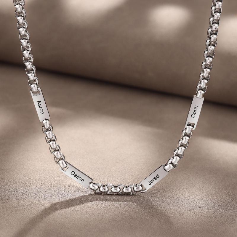 This custom-engraved stainless steel necklace holds the names of his children—up to five—etched cleanly on a durable, polished pendant. Minimalist in design, heavyweight in meaning.
