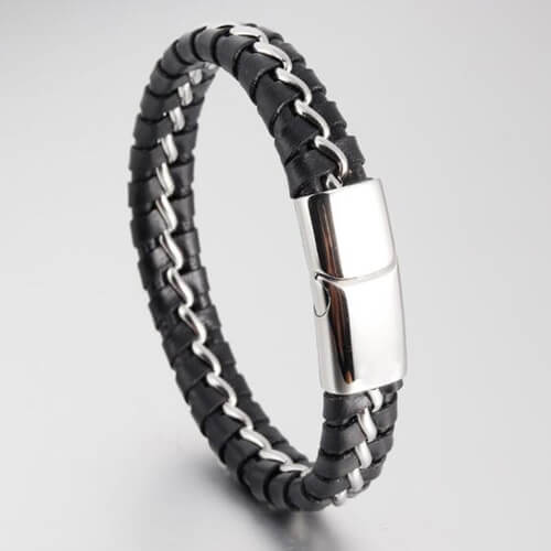 • Braided Design with a Stainless Steel Stripe in Silver-tone and Black, Masculine Piece of Women’s Jewelry.