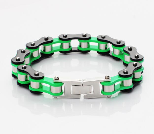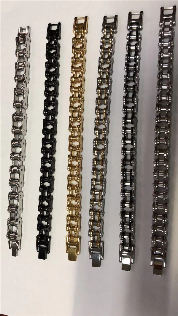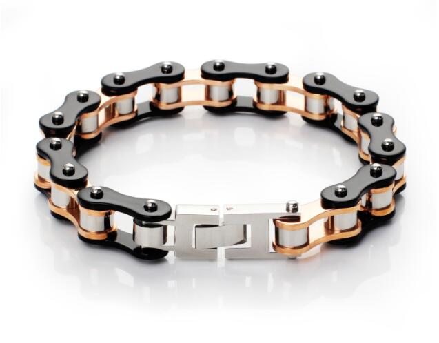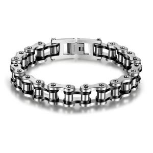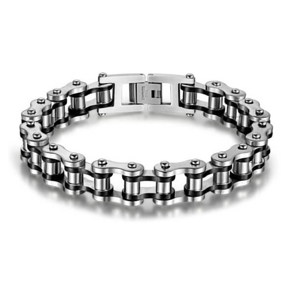 5. Highly polished stainless steel bike chain bracelet with black detailing.